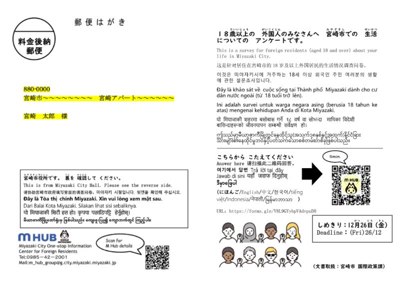 - 答(こた)える人(ひと): 宮崎市(みやざきし)に住(す)んでいる18歳(さい)以上(いじょう)の外国人(がいこくじん)の方(かた)